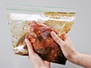 豚肩ロースのかたまりを保存バッグに入れ、味をしみ込ませる。